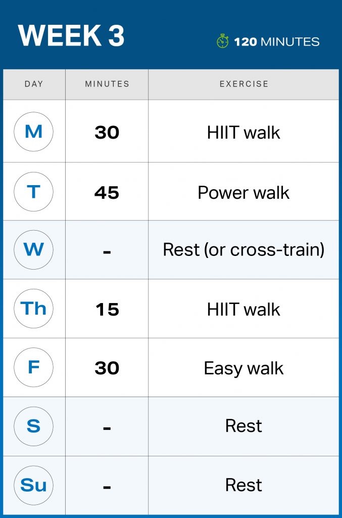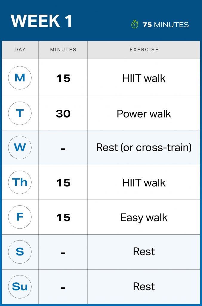 Remember that you can always adjust your walk days and times as needed to make them work for your schedule. And don’t forget to keep challenging yourself during the plan — as you become more fit, work on pumping up your pace when appropriate to cover more miles in less time.